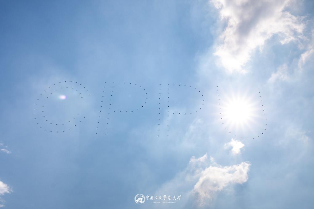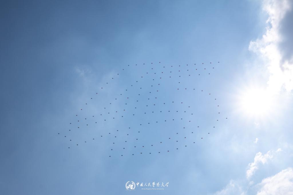 节目展演环节气势恢宏、大气磅礴。开场表演《众人划桨开大船》率先亮相,400名学子组成磅礴方阵,以刚劲有力的动作和严整如一的作风,充分诠释警大人万众一心、聚力前行的坚定信念。“利剑出鞘,智守蓝天”无人机表演呈上科技盛宴。由150架无人机组成的集群凌空而起,银翼齐展,精准编织“CPPU”“45”“警察敬礼”“正义长剑”等造型,既致敬了警大四十五载的辉煌历程,又彰显了警大师生实战砺兵、攻坚克难的铁血担当。警用多旋翼无人机战术编队飞临,与地面机器狗、战斗人员协同联动,构建起空地一体、人机协同的立体化作战体系。智慧警务学院500名大一新生以大型开场舞点燃全场热烈气氛,用铿锵律动奏响科创兴警、青春报国的时代强音。在引擎轰鸣中,穿越机方阵破空而至,彩烟绘就绚丽画卷,向警大建校45周年献礼。