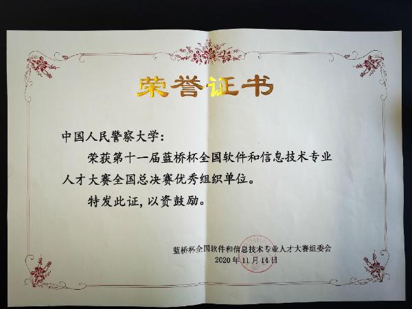 2020年11月14日,智慧警务学院网络安全与执法教研室组织并指导9名选手在第十一届蓝桥杯全国软件和信息技术专业人才大赛总决赛中斩获桂冠,在C/C++软件开发大学B组项目中获得全国二等奖3项、全国三等奖4项,全国优秀奖2项的好成绩,我校获得全国优秀组织奖。