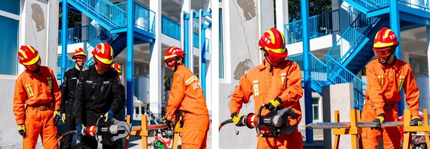 活动伊始,重点实验室SOE特别紧急救援队带领犬力应急志愿协会参观地震灾害模拟训练设施,体验地震倒塌楼VR设备,展示VR技术在灾情评估与安全风险识别中的优势,通过模拟加速、碰撞、倾斜等动作带来沉浸式体验。主持人致辞后,交流正式开始。SOE特别紧急救援队迅速进入状态,上演精彩破拆技术展示,以“提升救援通道开辟能力”为目标,队员携扩张器、液压剪等专业装备登场。展示中,数根钢材被固定为“实战目标”,SOE社长张凤志一边讲解操作要点,一边精准操控液压剪,瞬间剪断钢材,断面平整利落,现场惊叹连连。SOE团队成员表示,快速开辟救援通道直接关系受困者生命安全。犬力协会师生近距离感受破拆技术的专业与紧迫,对SOE成员的过硬本领表示由衷倾佩。